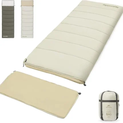 A great advantage is that two sleeping bags can be joined together if their zippers are positioned on opposite sides — right and left. For added comfort, the store also offers lightweight and warm sleeping bag liners.