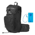Includes a whistle on the chest strap and a built-in hydration system with a tube holder on the shoulder strap.