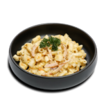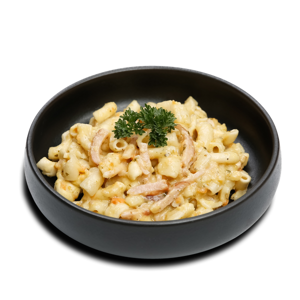 Макароны 50% (манная крупа твердых сортов пшеницы, вода); соус (плавленый сыр (сыр 32.7%, обезжиренное молоко, творог, сливки, эмульгаторы (E339, E450, E452), сухая сыворотка, сухое обезжиренное молоко), морковь, сливки, рапсовое масло, пшеничная мука, картофельный крахмал, лук, соль, петрушка, лимонный перец, чесночный порошок); копченая свинина (ветчина 96%, вода, соль, пшеничные волокна, гранулы чеснока, декстроза, черный перец); твердый сыр; специи.